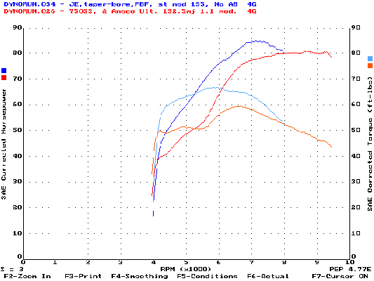 The results confirm that they don't suffer too badly from inlet resonance. One friends opinion, is, that the 750 engine doesn't send as strong a signal, resulting in less negative resonance. Then, above 8000 RPM the ports (which aren't overwhelmed as they might on a 900) start to recover and the power continues to rise.